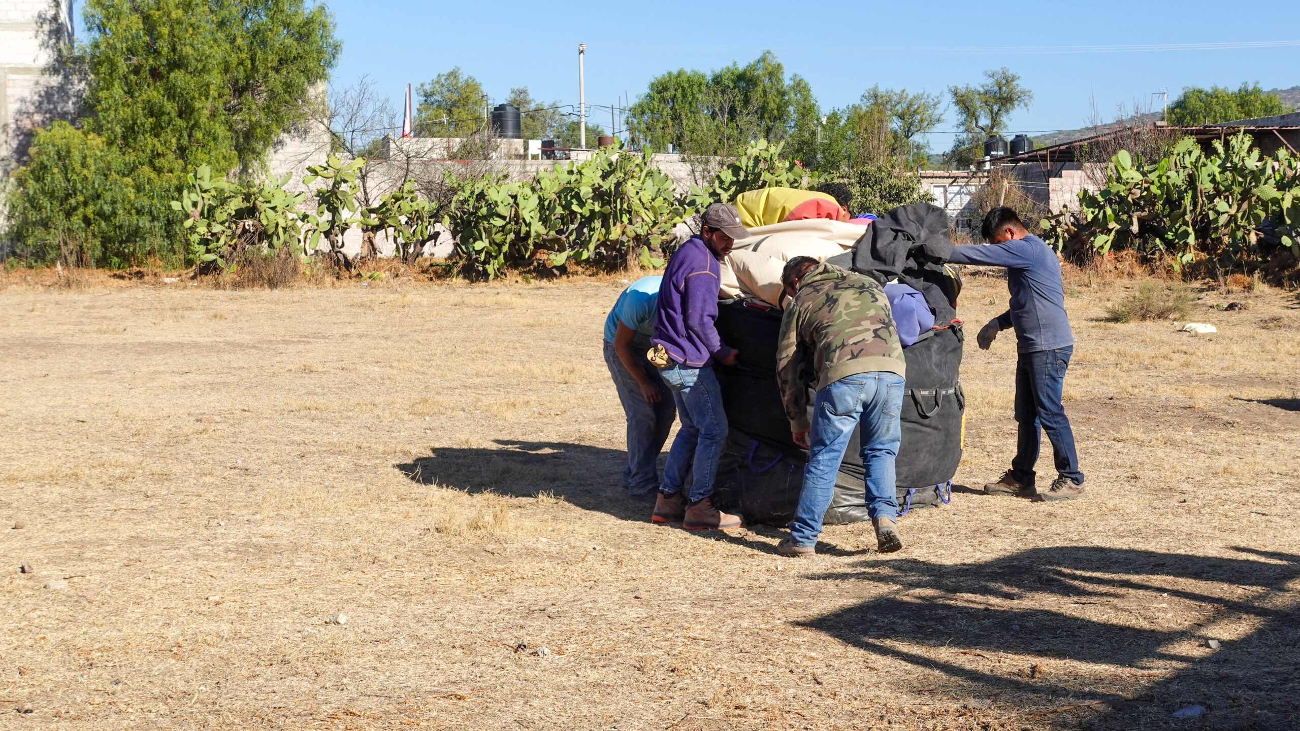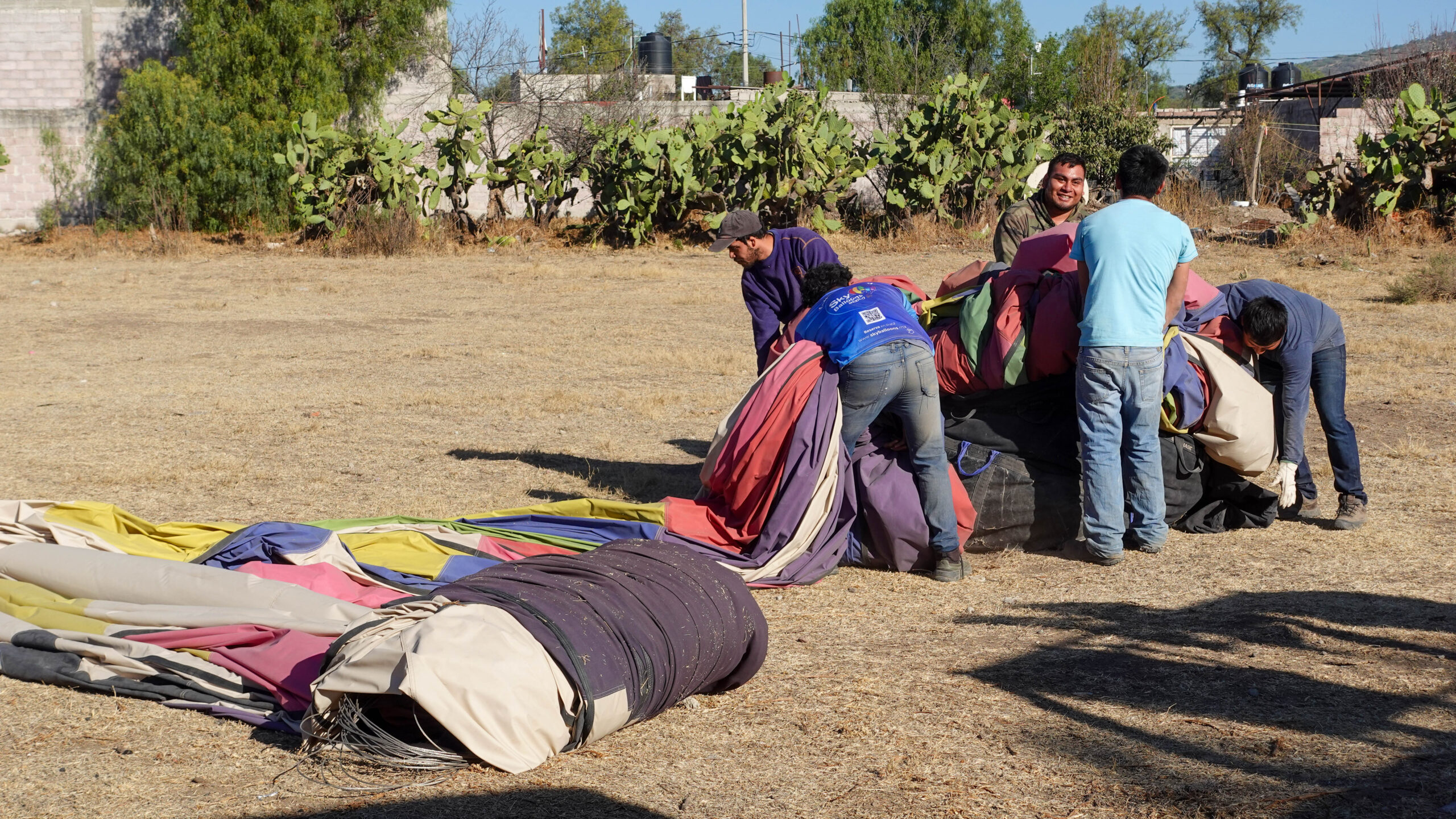 As you descend back to the ground. our pilot carefully guided the balloon to a safe landing spot and offered a champagne toast to celebrate a successful flight over Teotihuacan. A team of men drove up at our landing spot to fold the balloon and load it onto a cargo van, a process that took tremendous physical effort from what I could see.