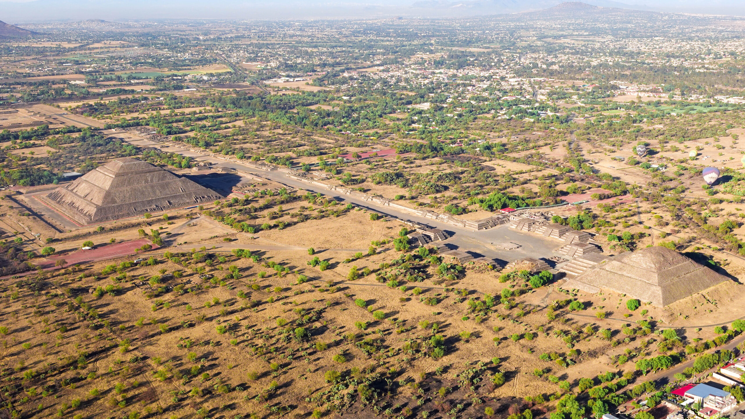 As you rise into the sky, the cool morning air fills your lungs, and the rising sun’s warm glow begins to paint the landscape a golden hue. From above, you can see iconic stone pyramids of Mexico City, including the Pyramid of the Sun, the Pyramid of the Moon, and the Temple of the Feathered Serpent.