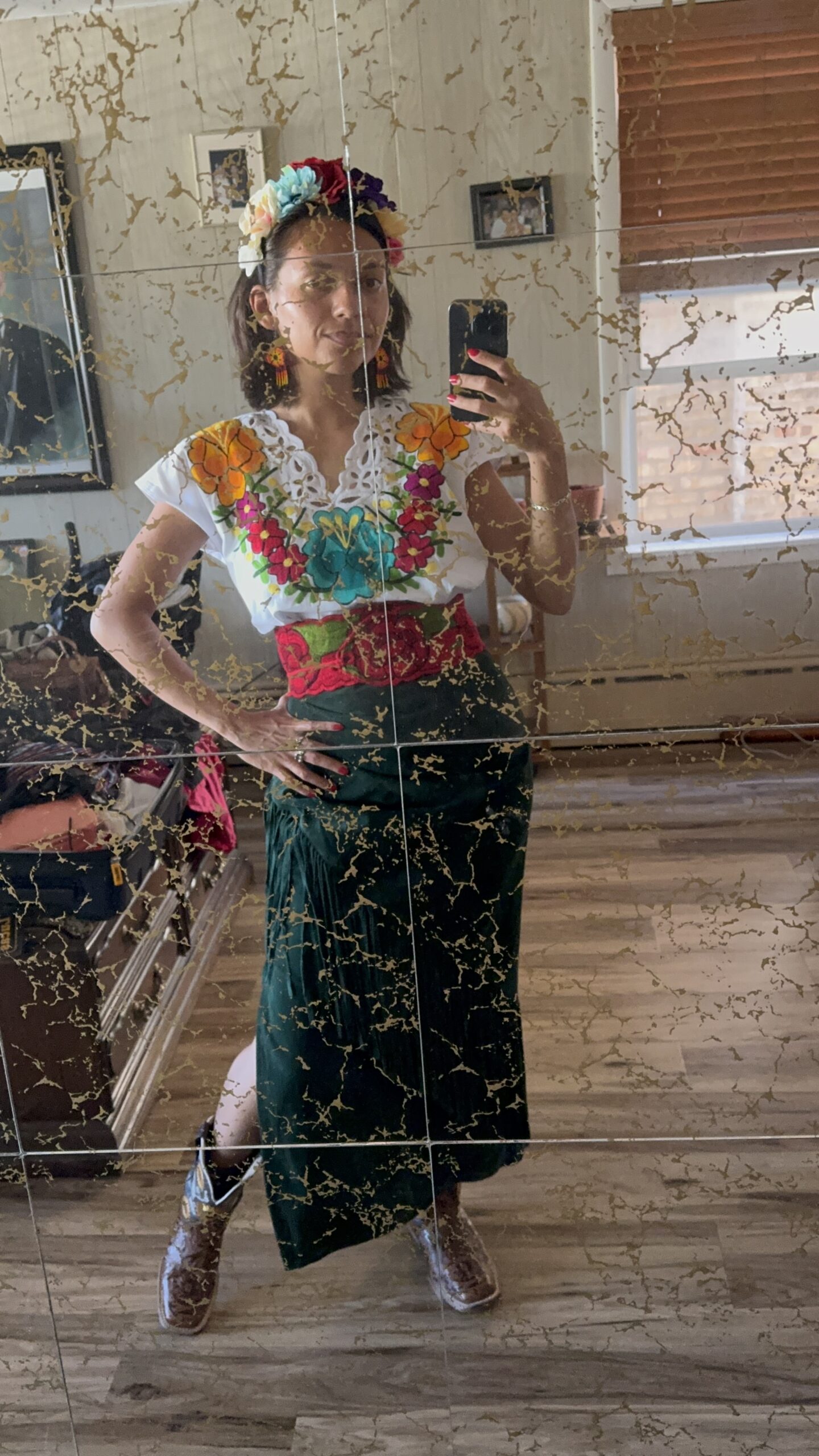 I got all dolled up in my cute outfit with pieces from Mexico to go to El Grito in Pilsen. I wore an embroidered blouse that’s rich in color, a flower crown, an embroidered belt, and a dark green leather skirt with boots. The event took up the street block in front of St. Paul Church in Pilsen.